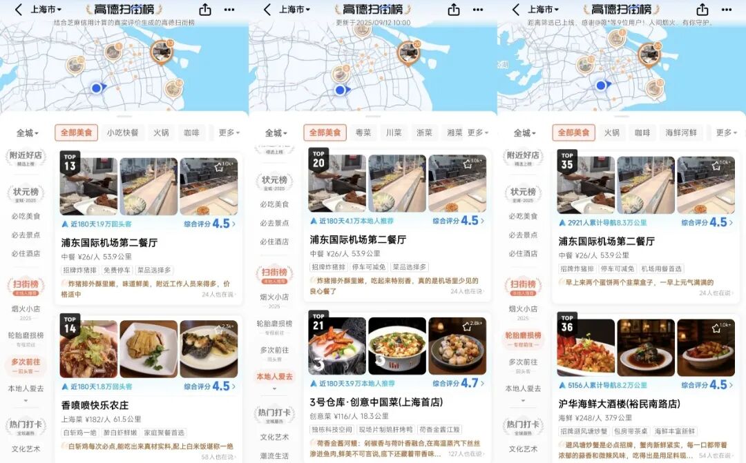 并且在选择餐厅时,游客们也更加依赖于社交媒体上的达人种草内容。如果对游客产生的数据和本地居民的选择不做任何区分,这就可能导致一个结果:越是靠近景区、热门打卡地的餐厅,去的人就越多,榜单上的位置也越靠前。这样的榜单,既不能代表本地用户的选择,也没有做到足够“真实”。