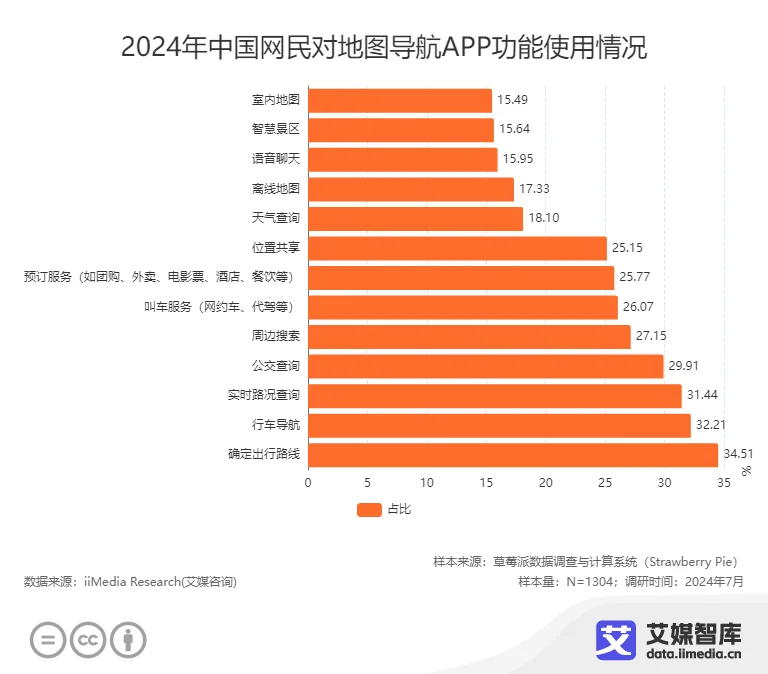2014年艾瑞的调研数据显示,有65.7%的用户使用地图仅为路线规划,而O2O功能(如团购、订餐)的使用率不足5%。而在2024年,艾媒咨询发布的《中国手机地图行业发展与用户画像研究数据》中提到,地图导航APP功能中,中国网民使用最多的前五个功能依次为确定出行路线(34.51%)、行车导航(32.21%)、实时路况查询(31.44%)、公交查询(29.91%)和周边搜索(27.15%),没有打车和预订服务(包括团购、外卖、酒店等)。