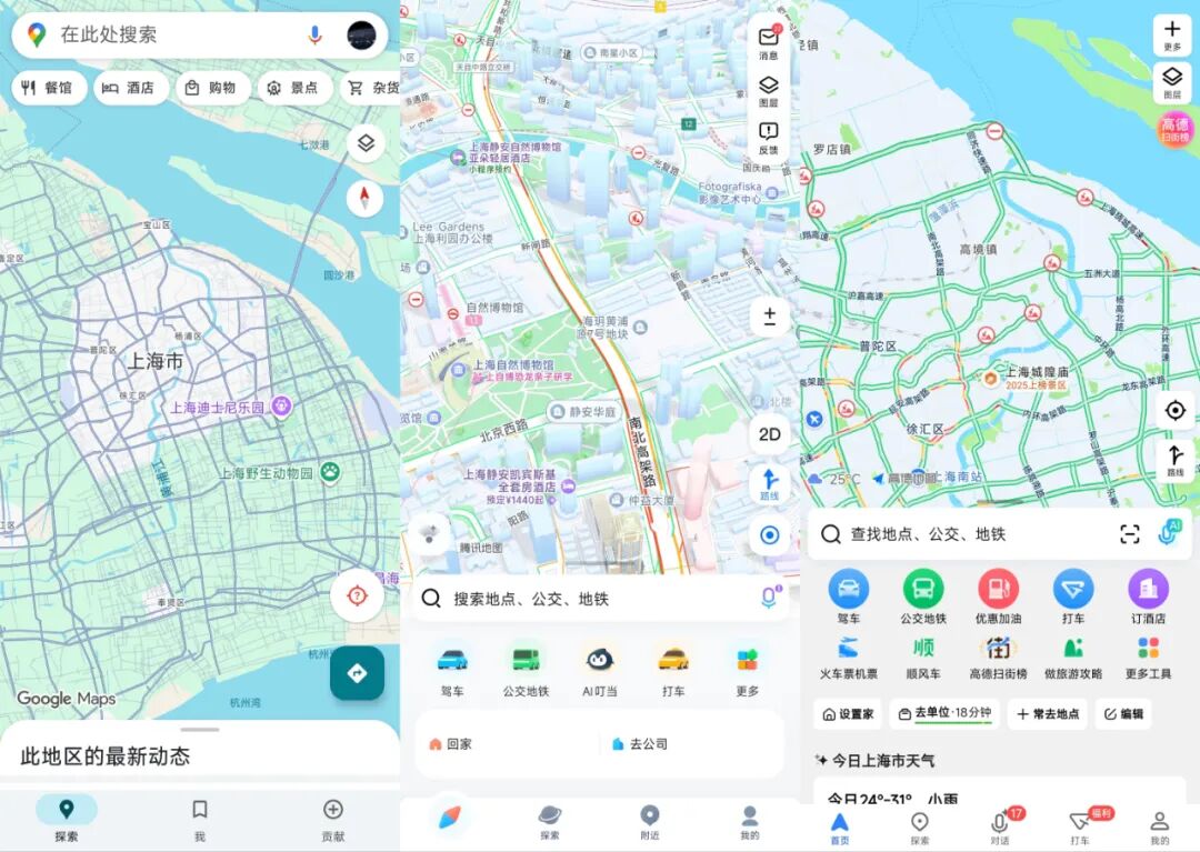 *从左往右依次为Google Map、腾讯地图、高德地图