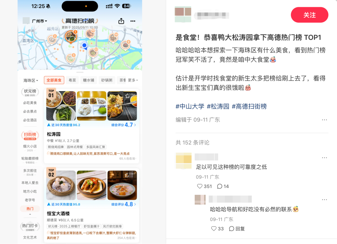 然而,高德的做法却与之背道而驰,它试图前置性介入到用户的决策流程里,让用户前往它推荐的目的地。它用各种榜单告诉用户哪里有美食、哪里有好玩的景点,让用户在它这里下单、团购,然后再导航。但这种推荐并不靠谱。比如,在高德的美食热门榜上,广州中山大学的食堂竟然登上了榜首,这只是因为开学季就餐人数暴增,与美味无关。