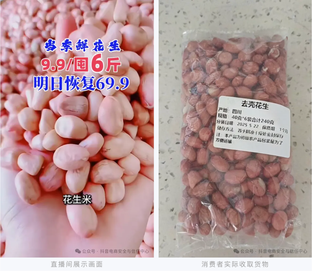 例如,一些商家和达人在直播过程中,对花生米等食品的规格进行虚假描述,直播间展示文字“9.9/囤6斤”,商品标题也突出“(六斤六斤的囤)”等易混淆信息,误导消费者以为是“9.9元买6斤花生”,实际商品规格却是“1包共6袋、合计240g”的花生。针对此类违规行为,抖音电商截至8月,永久取消近3.7万达人的带货权限,清退1778个违规商家。