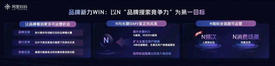 阿里妈妈给出了一个科学且能够数据可视化的度量模型——品牌新力WIN,今年双11已经进化到3.0的版本,将“搜索“这一指标进一步细化分为品牌全貌、细分竞争和创意效率三个维度。
