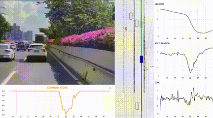 AI指标模块,就是根据安全、合规、舒适、效率等多维度建立的一套量化评估体系,它能将自动驾驶的行驶数据转化为可对比、可分析的指标。例如在道路被侵入的场景中,AI指标模块就实时打出了乘客舒适度评分。评分反馈能直接可视化,训练环节就能针对性优化与复验。值得一提的是,下图的画面、数据都是由WeRide GENESIS生成。目前行业要完成舒适性测试,基本都要靠真实场景测试完成。