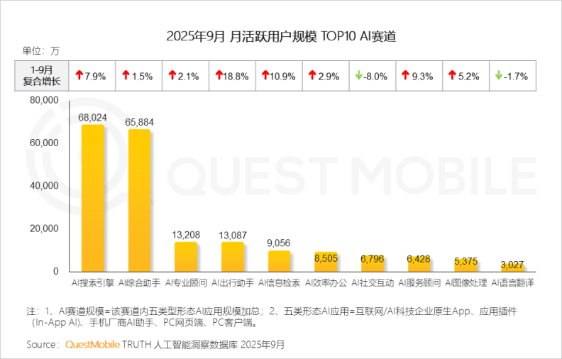 据QuestMobile《2025-2026年度核心趋势报告》数据,2025年9月,月活跃用户规模排在Top 1的,正是AI+搜索。比起排名第二的AI综合助手复合增长率仅有1.5%,AI搜索引擎的增长趋势较前者更明显。